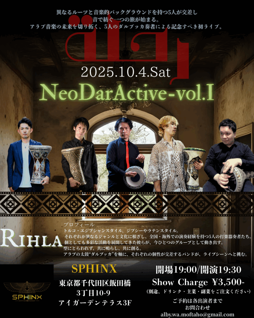 アラブの太鼓「ダルブッカ」を軸にそれぞれの個性が交差するバンドが、ライブシーンへと挑む。