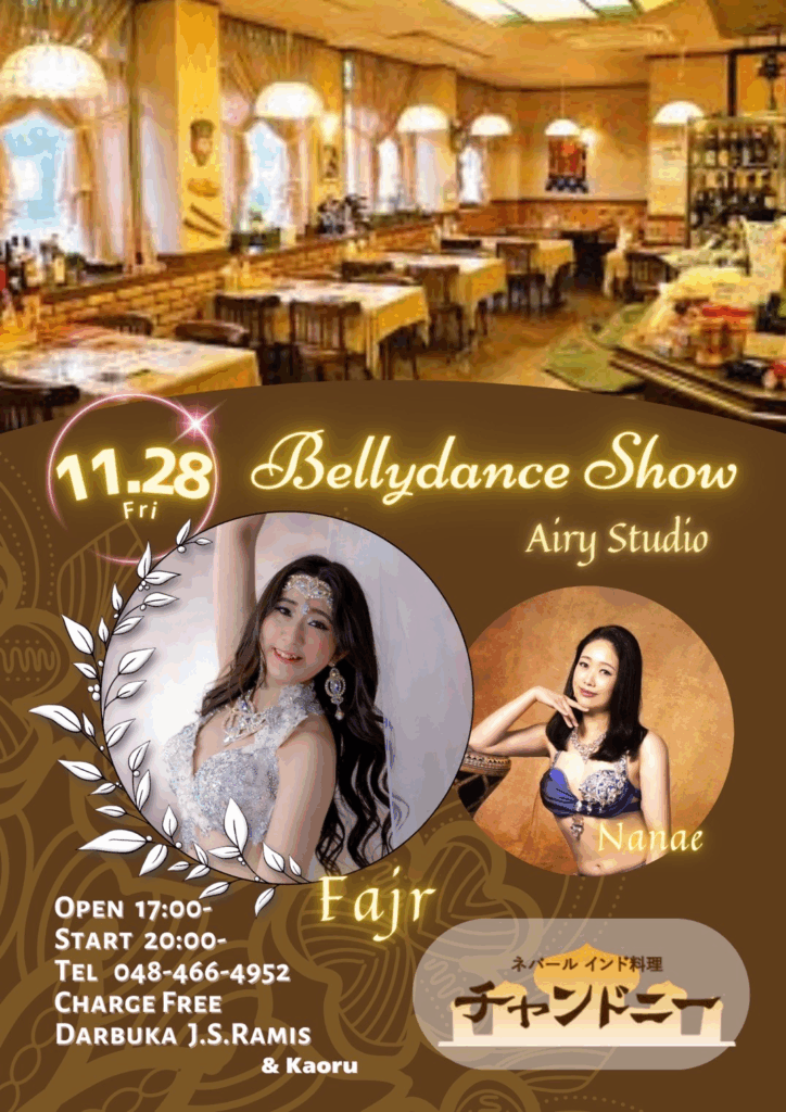 11/28(金) 朝霞チャンドニー 開場 17:00~ 開演(ダラブッカ) 20:00~ 開演(ベリーダンス) 20:30~ 観覧料 無料(ご飲食をお願いいたします) 会場 ネパール・インド料理 チャンドニー 住所 埼玉県朝霞市岡3-1-5 電話 048-466-4952